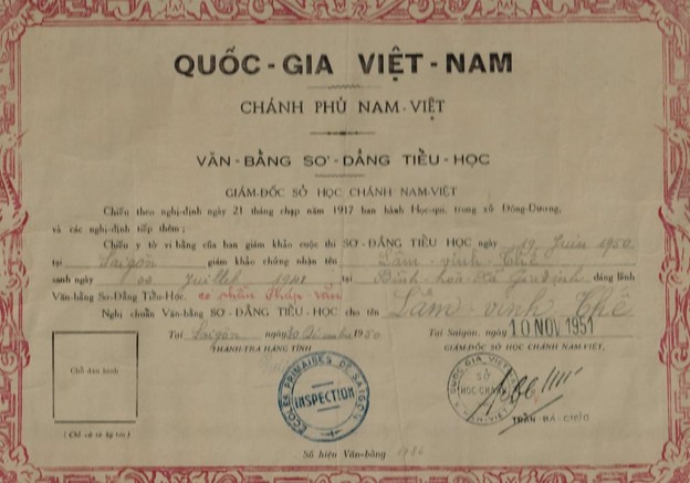 Thật rất tiếc tôi không còn nhớ được tên Cô giáo đã dạy tôi ở Lớp Năm A. Qua năm sau, niên khóa 1949-1950, tôi được lên lớp, và được xếp học Lớp Tư A do Thầy Hai phụ trách. Thầy Hai lúc đó đã có tiếng là một thầy thuộc loại “dữ” hay đánh học trò khi học tò phạm lỗi. Thầy Hai người tầm thước trung bình, với đặc điểm là cặp chân mày có nhiều lông dài và đã bạc, mặc dù lúc đó thầy chỉ mới độ trên 40 tuổi thôi. Bọn học trò chúng tôi, dĩ nhiên, là rất sợ thầy, nên trong lớp lúc nào cũng êm ru, rất là kỷ luật. Nhờ vậy bọn tôi học có kết quả rất tốt. Cuối năm đó, bọn tôi được lên lớp Ba hết. Tựu trường niên khóa 1950-1951, tôi lên Lớp Ba A và giáo viên phụ trách lớp tôi là Thầy Diệp. Thầy Diệp lúc đó độ trên dưới 40 tuổi, chiều cao trung bình, người hơi mập, bệ vệ, mặt lúc nào cũng trắng hồng (về sau, lúc ở Đại Học, tôi lại được học với người con trai lớn của Thầy Diệp, đó là Giáo sư Nguyễn Bá Nhẩn, dạy tôi năm thứ ba về môn Địa Lý Kinh Tế). Cuối năm Lớp Ba, học sinh phải đi thi lấy Văn-Bằng Sơ-Đẳng Tiểu-Học. Vì vậy, Thầy Diệp đã dạy bọn tôi rất kỷ về môn Toán và bắt bọn tôi làm bài tập rất nhiều, ngày nào Thầy cũng cho bài về nhà làm, hôm sau đem vô nộp cho Thầy chấm. Thầy cũng bắt bọn tôi học thuộc lòng nhiều bài “récitation” tiếng Pháp. Nhờ vậy, cuối năm đó, tôi đi thi và đã đậu kỳ thi này. Văn-Bằng Sơ-Đẳng Tiểu-Học của tôi, như trong hình bên dưới đây, có ghi rõ ngày của kỳ thi là ngày 19-Juin-1950 và kỳ thi có phần Pháp văn được ghi thêm bằng mực đỏ. Viên chức chính phủ ký tên và đóng dấu phía bên dưới của văn-bằng là cụ Trần Bá Chức, lúc đó là Giám Đốc Sở Học Chánh Nam Việt. (sang thời Đệ Nhứt Cộng Hòa, cụ Trần Bá Chức đãm nhận chức vụ Tổng Giám Đốc Trung Tiểu Học và Bình Dân Giáo Dục). Mẹ tôi và các anh chị của tôi rất “mừng cho thằng Út.” Và, với văn-bằng đầu tiên này trong cuộc đời học trò, tôi đương nhiên được lên Lớp Nhì vào ngày tựu trường của niên học kế tiếp, 1950-1951.