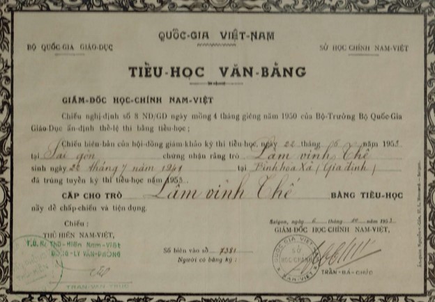 Thật rất tiếc tôi không còn nhớ được tên Cô giáo đã dạy tôi ở Lớp Năm A. Qua năm sau, niên khóa 1949-1950, tôi được lên lớp, và được xếp học Lớp Tư A do Thầy Hai phụ trách. Thầy Hai lúc đó đã có tiếng là một thầy thuộc loại “dữ” hay đánh học trò khi học tò phạm lỗi. Thầy Hai người tầm thước trung bình, với đặc điểm là cặp chân mày có nhiều lông dài và đã bạc, mặc dù lúc đó thầy chỉ mới độ trên 40 tuổi thôi. Bọn học trò chúng tôi, dĩ nhiên, là rất sợ thầy, nên trong lớp lúc nào cũng êm ru, rất là kỷ luật. Nhờ vậy bọn tôi học có kết quả rất tốt. Cuối năm đó, bọn tôi được lên lớp Ba hết. Tựu trường niên khóa 1950-1951, tôi lên Lớp Ba A và giáo viên phụ trách lớp tôi là Thầy Diệp. Thầy Diệp lúc đó độ trên dưới 40 tuổi, chiều cao trung bình, người hơi mập, bệ vệ, mặt lúc nào cũng trắng hồng (về sau, lúc ở Đại Học, tôi lại được học với người con trai lớn của Thầy Diệp, đó là Giáo sư Nguyễn Bá Nhẩn, dạy tôi năm thứ ba về môn Địa Lý Kinh Tế). Cuối năm Lớp Ba, học sinh phải đi thi lấy Văn-Bằng Sơ-Đẳng Tiểu-Học. Vì vậy, Thầy Diệp đã dạy bọn tôi rất kỷ về môn Toán và bắt bọn tôi làm bài tập rất nhiều, ngày nào Thầy cũng cho bài về nhà làm, hôm sau đem vô nộp cho Thầy chấm. Thầy cũng bắt bọn tôi học thuộc lòng nhiều bài “récitation” tiếng Pháp. Nhờ vậy, cuối năm đó, tôi đi thi và đã đậu kỳ thi này. Văn-Bằng Sơ-Đẳng Tiểu-Học của tôi, như trong hình bên dưới đây, có ghi rõ ngày của kỳ thi là ngày 19-Juin-1950 và kỳ thi có phần Pháp văn được ghi thêm bằng mực đỏ. Viên chức chính phủ ký tên và đóng dấu phía bên dưới của văn-bằng là cụ Trần Bá Chức, lúc đó là Giám Đốc Sở Học Chánh Nam Việt. (sang thời Đệ Nhứt Cộng Hòa, cụ Trần Bá Chức đãm nhận chức vụ Tổng Giám Đốc Trung Tiểu Học và Bình Dân Giáo Dục). Mẹ tôi và các anh chị của tôi rất “mừng cho thằng Út.” Và, với văn-bằng đầu tiên này trong cuộc đời học trò, tôi đương nhiên được lên Lớp Nhì vào ngày tựu trường của niên học kế tiếp, 1950-1951.