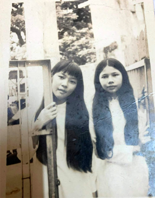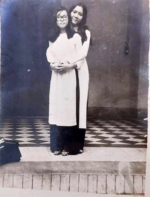 Hình 11. Hình ảnhThân thương của hai bạn Nguyễn thị Xuân Lan (đeo kiếng) cùng với Bùi Phương Mai. Ảnh chụp nơi bậc thềm chính giữa của toà nhà bên cánh phải, từ hành lang Danh dự đi vào.