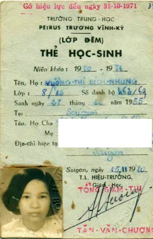 Hình 19. Thẻ học sinh bạn Vương thị Bích Nhung năm lớp 8, nk 1970-1971, ngựời bạn học cùng lớp và có năm ngồi cùng bàn với Ái Khanh, từ đệ Lục của năm 1969 (với lớp đêm đầu tiên) cho đến hết lớp 12 năm 1975.