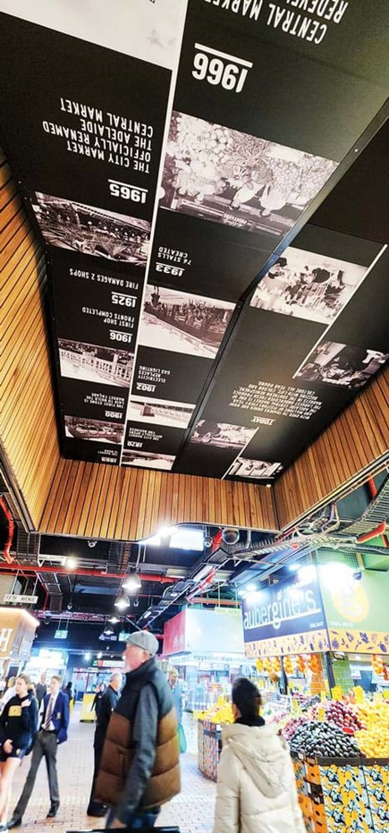 Central Market ở Adelaide (Úc) luôn trưng bày hình ảnh chợ xưa và thông tin lịch sử 150 năm ngôi chợ (ảnh chụp ngày 11.8.2023).