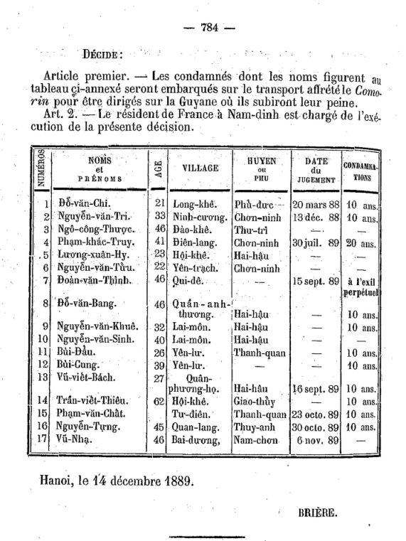 Tài liệu sau đây cho thấy 17 phạm nhân ở Bắc Kỳ đã bị đầy sang Guiana trước cuộc khởi nghĩa Yên Bái gần nửa thế kỷ. Trong suốt lịch sử là thuộc địa của Pháp, phần lớn tù nhân Việt Nam bị đầy khổ sai biệt xứ có lẽ là thường phạm hơn là chính trị phạm.