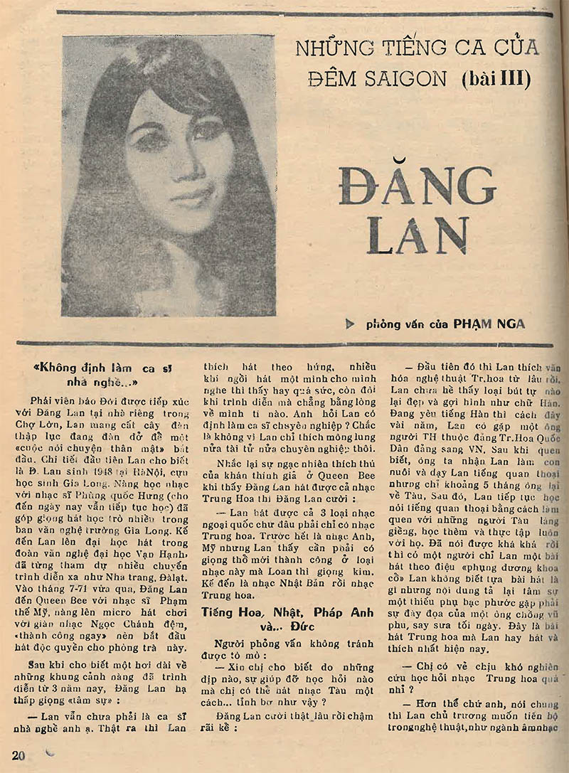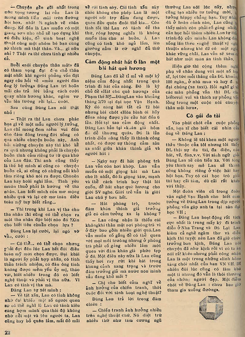| Trên số báo 96 ra ngày 19/8/1971, tuần báo Đời của ‘Chủ Tử và nhóm Sống’ ở Sài Gòn thời ấy đã khởi đăng loạt bài theo chủ đề ‘Những tiếng ca của đêm Sài Gòn’ với Bài 1 có tựa ‘Tam ca Đông Phương’ do Phạm Nga thực hiện. Đến số báo 98 ra ngày 2/9/1971, khi thực hiện tiếp chủ đề trên, tôi nảy ý nên sớm giới thiệu những ca sĩ trẻ đang có nhiều triển vọng. Và tôi đã tìm đến Đăng Lan trước tiên. Lý do cũng đơn giản thôi là khi ấy, tôi nghe chị Đăng Lan đang hát trong Đoàn Văn nghệ Sinh viên của Trường ĐH Vạn Hạnh thì trường này vốn là nơi tôi thường lui tới – nhất là quán cà phê Nắng Mới, căn-tin của SV nhà trường, ở ngay bên trái cổng vào – để gặp gỡ, cà phê cà pháo với một số bạn đang học Triết Tây bên Văn Khoa Sài Gòn với tôi lại ghi danh học thêm Triết Đông bên Vạn Hạnh. Vào cái năm 71 của thế kỷ trước, chị Đăng Lan và tôi – tức ca sĩ được phỏng vấn và nhà báo đến phỏng vấn – đều còn ở lứa tuổi sinh viên tóc xanh son trẻ, vừa lui tới giảng đường vừa có công việc làm thêm – ca hát hay làm báo. Thế rồi, sau buổi tiếp-xúc-công-việc nhưng hiển nhiên là một “cuộc nói chuyện thân mật” ngày ấy, thời gian không ngừng trôi với biết bao đổi thay mà tác động sâu, nặng nhất là biến cố 30-4 xảy đến năm 1975, chị Đăng Lan và tôi, cả hai cứ mỗi người một thân phận, trôi dạt theo thăng trầm của cuộc đời… Mãi đến năm 2023, tôi sang định cư ở Australia, khi đến sinh hoạt với Hội Ái Hữu Petrus Ký Úc Châu, thật vui quá vui là trong một buổi họp mặt mừng năm mới 2024 của Hội, tôi gặp lại chị Đăng Lan. Thì ra, cô ca sĩ gốc SV, từng hát phòng trà Queen Bee với ban nhạc Ngọc Chánh lừng danh ở Sài Gòn ngày xưa đã là bà xả của anh Trần Văn Phan (PK 1954 – 1961). Ngày nay, “cô dâu nhà Petrus Ký” này đang là một trong những hạt nhân duyên dáng, năng nổ của phong trào văn nghệ của anh chị em trong Hội. Vào các dịp họp mặt của Hội, ngoài việc vừa lên hát và đệm đàn thập lục, chị Đăng Lan còn có thể dẫn dắt, tập ngay-tại-chỗ cho các anh chị em vốn chỉ biết ca hát nghiệp dư có thể cùng chị hòa giọng thật ‘khí thế’ các bản hợp ca như Tình Ca (Phạm Duy), Hồn Vọng Phu (Lê Thương)… (P.N.) |