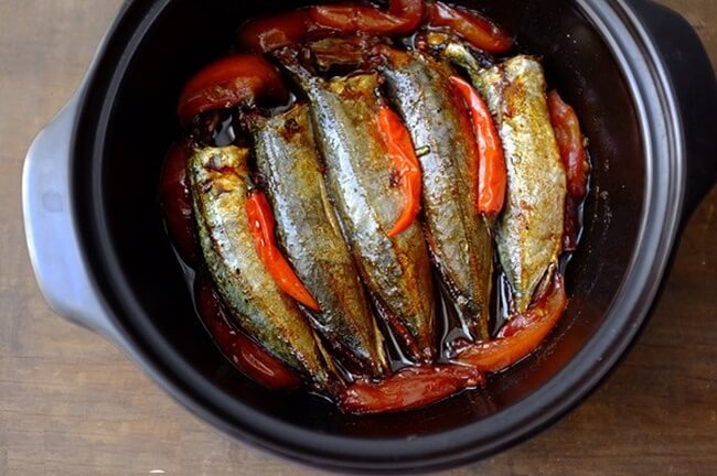 Cho vài miếng dứa, rau răm, riềng vào đáy nồi, rồi cho cá đã lột da vào, thêm nước mắm, đường, nước màu, nước sôi vào cho xấp xấp cá, nhớ là nước sôi, nếu thêm nước lạnh cá sẽ tanh, đun sôi, kho cho tới khi nước sền-sệt, cho dứa và rau răm dưới đáy nồi cháy xém một tí, thêm một thìa canh rượu Cô-Nhắc, tắt lửa. Thịt cá sẽ thơm, dai, ngọt và xương cũng mềm, tuyệt diệu. Cá nục Na Uy rất rẻ, chừng 1,99$ (1 pound) và thời gian kho chừng một giờ là xong. Anh có muốn thử cho biết thì ngồi đó chờ, cơm nóng đi với cá nục kho thì no cành hông.