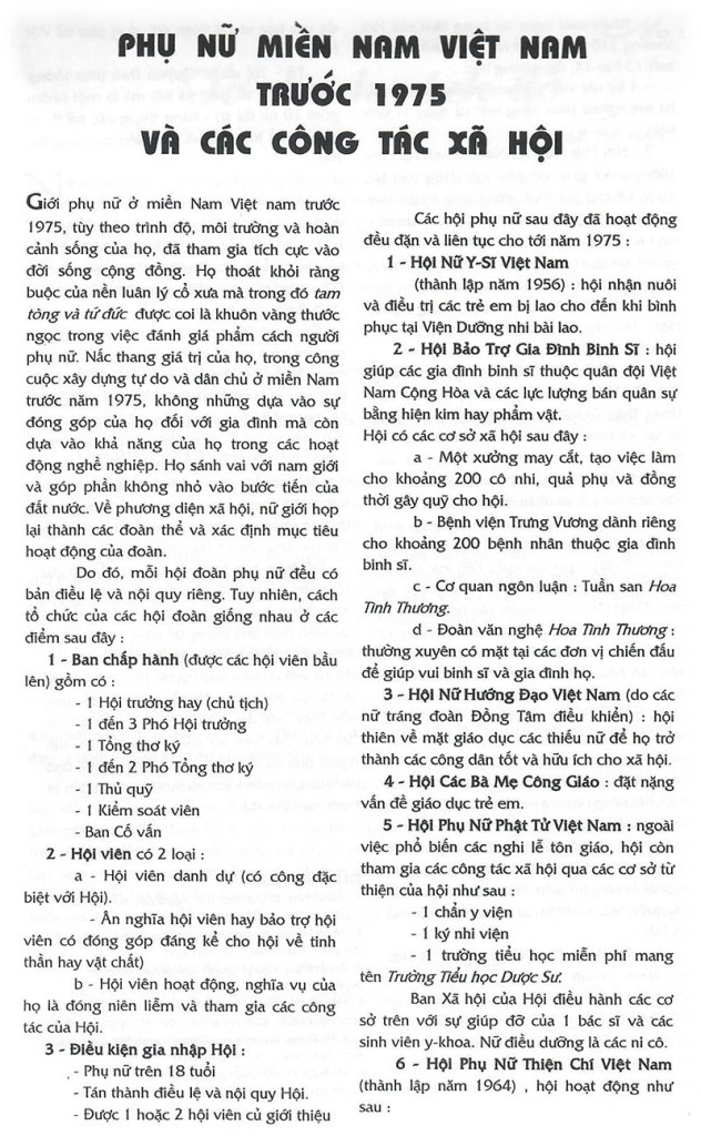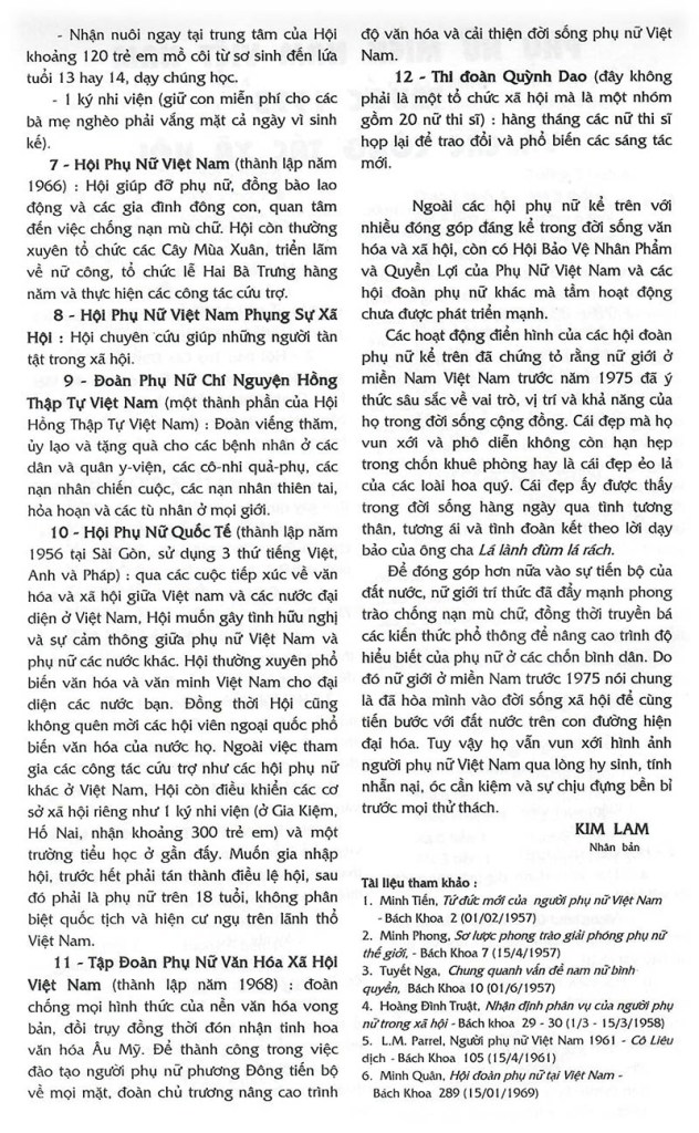Phụ nữ miền nam Việt Nam trước 1975 và các công tác xã hội Kim Lam (Nguồn: Nội san – Hè 2004, Hội Ái hữu Trung học Petrus TVK tại Pháp) Share this: Share on X (Opens in new window) X Share on Facebook (Opens in new window) Facebook Like Loading...