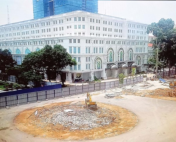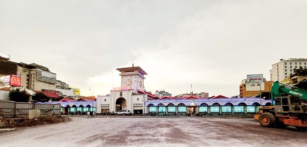 Mặt tiền chợ Bến Thành và một phần công trường Quách Thị Trang đang được tái lập sau khi hoàn thành đường ngầm metro. Ảnh chụp chiều 10.6.2022