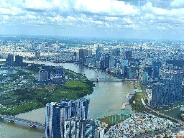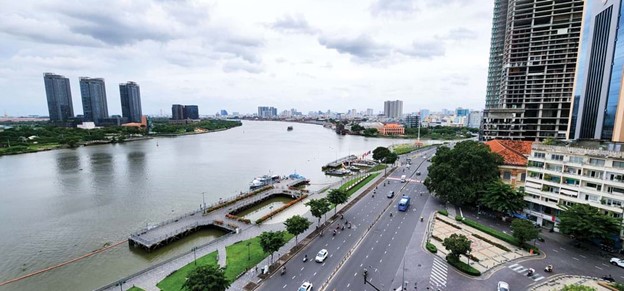 Khu trung tâm hành lang dọc hai bờ sông Sài Gòn nên là khu vực từ cầu Sài Gòn đến cảng Khánh Hội và Tân Thuận cùng phía đối diện trên bán đảo Thủ Thiêm. Ảnh chụp không gian hai bờ sông từ bến Bạch Đằng đến cảng Khánh Hội nhìn từ khách sạn Majestic (7.2023)