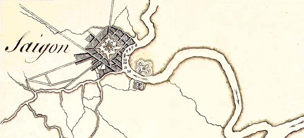 Một phần bản đồ của Dayot (1791) vẽ quy hoạch thành Gia Định và đoạn sông Sài Gòn khu vực quận 1 đối diện bán đảo Thủ Thiêm. Các con số ghi trên dòng sông là độ sâu lòng sông vào thời ấy (nguồn Thư viện quốc gia Pháp).