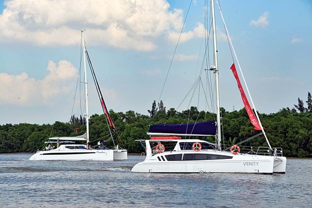 Những chiếc du thuyền hai thân giá hàng triệu USD lướt trên sông Sài Gòn. Ảnh: CTV