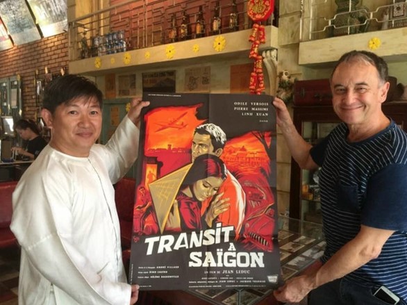 Ông Philipe Chaplain (bên phải), chủ tịch Tổ chức Di sản Pháp, trao tặng poster phim Mỹ “Transit à Saigon” (có minh tinh Kiều Chinh đóng) cho nhà sưu tập Huỳnh Minh Hiệp vào năm 2018 – Ảnh: Huỳnh Minh Hiệp cung cấp