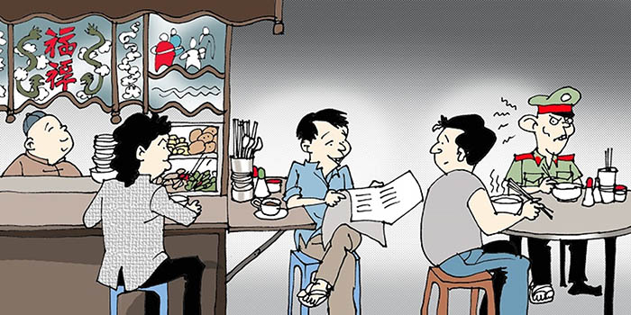 Sáng Chủ Nhựt, Tư Quảng ngồi tréo ngoảy trong quán, đọc báo oang oang cho người nghe một chút.