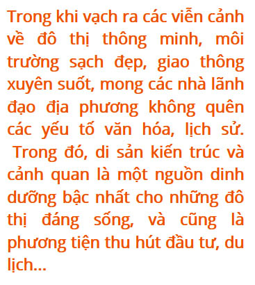 Chúng tôi cho rằng nội dung “quản trị đô thị” của chính quyền các cấp trong nhiệm kỳ mới cần được bổ sung chi tiết về “quản trị di sản”. Trong khi vạch ra các viễn cảnh về đô thị thông minh, môi trường sạch đẹp, giao thông xuyên suốt, mong các nhà lãnh đạo địa phương không quên các yếu tố văn hóa, lịch sử. Trong đó, di sản kiến trúc và cảnh quan là một nguồn dinh dưỡng bậc nhất cho những đô thị đáng sống, và cũng là phương tiện thu hút đầu tư, du lịch…