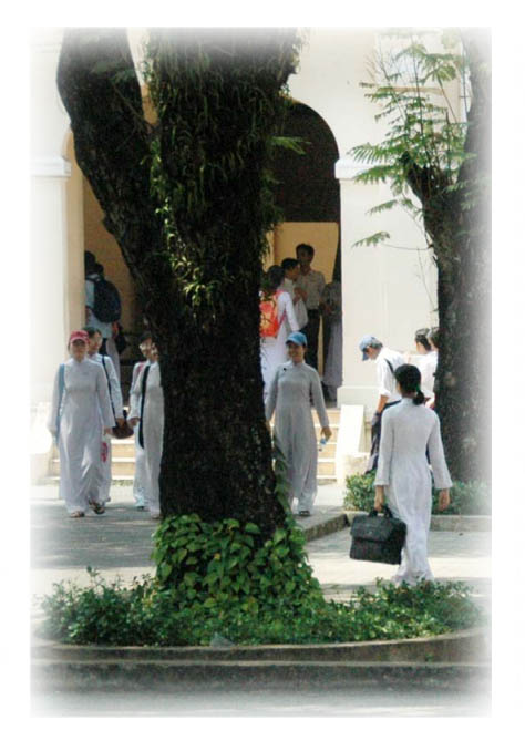 Gần đây áo dài may từ Việt nam gửi sang gặp phải than phiền vì hàng nút áo nay không còn nữa mà dây kéo đã thay vào, nhiều cô luyến nhớ hò áo của những tháng ngày đã xa còn trong tà áo học trò. Áo dài trắng có lẽ là phổ thông nhất, chắc trong chúng ta ai cũng tới áo tím khi nhắc đến nữ sinh Việt Nam. Thời đi học gần trường Petrus Ký có hai trường tư thục Công giáo là trường Thánh Linh nữ sinh mặc áo dài mầu xanh da trời, trường Chí Thiện thì nữ mặc. áo dài mầu hồng phấn cũng như trường Thiên Phước ở Tân Định. Giờ tan trường trông rực rỡ đẹp não nùng! Đến giờ tôi vẫn không hiểu sao không có bài hát nào tà áo trắng Gia Long trong khi bản nhạc Trưng Vương Khung Cửa Mùa Thu dã trở nên một phần di sản văn hóa phi vật thể của thi ca lứa tuổi học trò. Bạn tôi có người bảo tôi là khung cảnh trường Trưng Vương gần Vườn Bách Thảo xanh xanh cây lá hữu tình dễ gợi tứ cho khách văn chương sáng tác, còn trường Gia Long trông ra đường Phan Thanh Giản ồn ào xe cộ khói bụi mịt trời… Sau này, đường phố đổi tên, trường ấy cũng đổi tên. Nhưng tôi cứ ấm ức vì ngôi trường tôi thân yêu cũng đổi tên, giá như xứng đôi như… Bùi Thị Xuân. với Trần Quang Diệu hai vợ chồng sinh vi tướng tử vi thần, (nào dám ví von tới cặp đôi trong truyện của Nam Cao)…có đỡ ngượng hơn không? Biết bao bạn đồng môn vong niên hay cùng lứa bảo tôi họ không về thăm trường nữa cũng vì chuyện đổi tên… Tôi thì coi như việc sân trường cũ giờ đây ối tà áo trắng phất phới bay, trong phòng thí nghiệm những nữ sinh, tay áo xắn gần khuỷu tay trông đến hay, là chuyện thỏa niềm mơ. Tôi không dám dẫn thơ vì ngại rằng khuông cho báo có hạn mà đuổi bắt hạn kỳ cho kịp nộp bài đã hụt hơi!