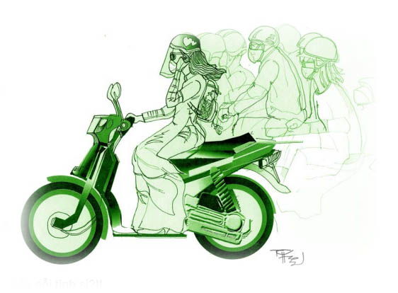 Bây giờ Việt Nam bụi khói kinh hoàng, ngườ i con gái Việt Nam ra đường che kín như phụ nữ các nước Hồi giáo! Các cô đeo găng đến tận vai, đeo mặt nạ/khẩu trang, kính mát tận mắt, nhiều cô thân trọng khoác thêm một áo ngoài chống che nắng và mưa. Rồi lệnh nhà nước người dân phải đội nón bảo hiểm. Áo dài ngày nào bây giờ gói trọn trong một mớ phù sinh nhốn nháo chắn che bảo bọc như Chiêu quân khi phải đem cống sứ sang Hồ!