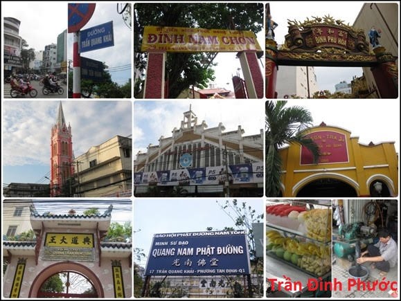 Đi thêm một chút nữa sẽ gặp đình Nam Chơn, số 29TQK. Trước đình có thờ hình ông Cọp rất oai vệ. Bên trái cổng, nằm trong sân đình có cây đa to, rễ đan với nhau chằng chịt. Có lẽ nó được trồng đã hơn một thế kỷ? Hiện nay đình Nam Chơn được xếp là “Di tích Kiến Trúc Nghệ Thuật” cần phải bảo tồn. Về đêm có dạy võ thuật, rất đông thanh thiếu niên đến tập luyện. Thêm vài bước nữa là một Phật Đường nhỏ của người Hoa, phía trước có hai cây Mai Tứ Quý đã già, hoa nở quanh năm. Phật Đường thuộc Giáo Hội Phật Đường Nam Tông có tên là Minh Sư Đạo Quang Nam Phật Đường. Nghe đâu Phật Đường này sẽ được xây dựng lại thành nhiều tầng. Mọi chi phí, tốn kém đều do các Hoa Kiều ở nước ngoài gửi tiền về giúp. Hiện đã lên kế hoạch và đang xin phép chính quyền xét duyệt.