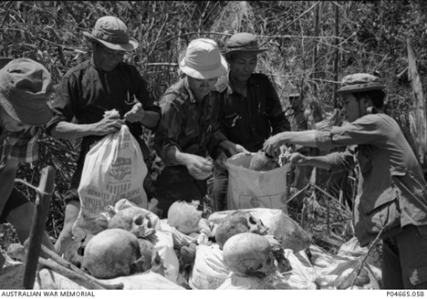 Kết quả một vụ thảm sát dưới tay cộng sản Việt Nam tại khe Đá Mài phía nam Huế, tháng 2, 1968 Tết Mậu Thân. 428 nạn nhân đa số người Thiên chúa giáo, gồm tu sĩ công chức, bác sĩ, giáo sư và những chuyên viên ngành nghề khác. Nạn nhân bị bắt giữ ở nhà thờ Phú Cam Huế trước khi bị dẫn ra khỏi thành phố vào đầu tháng 2 năm 1968 và bị bắn chết dọc theo bờ lạch. Theo thông tin của cán binh địch đào ngũ Sư đoàn Bộ binh 101 (di động không kỵ) tìm thấy xác nạn nhân ngày 19 tháng 9, năm 1969. Nguồn: Nguyen, Huu Hien, 23 February 1969.
