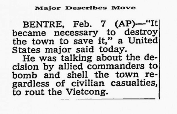 “It became necessary to destroy the town in order to save it” – Nguồn gốc của câu tuyên bố “nổi tiếng” này là bài tường trình từ Bến Tre của Peter Arnett (AP) ngày 7 tháng 2, 1968. Theo Mona Charen, đầu đuôi câu chuyện như sau (4).