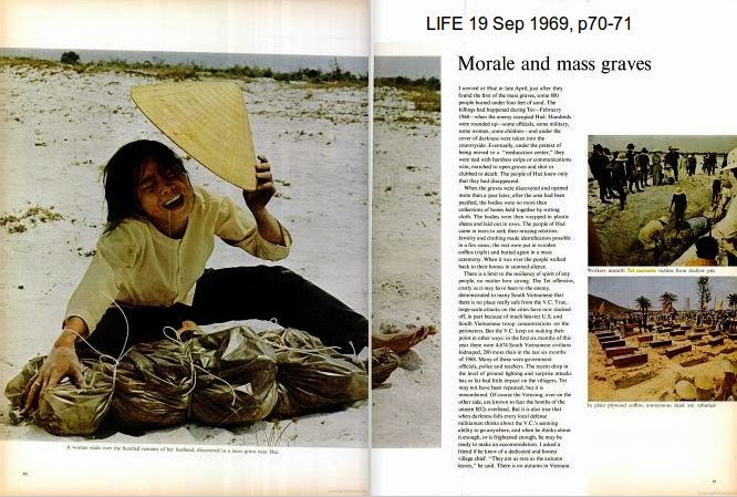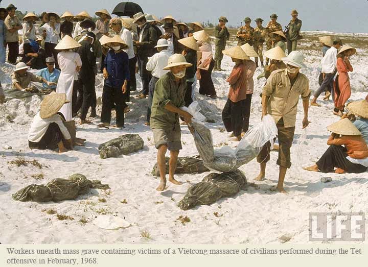 “Cuối tháng 2, 1968 khi quân đội VNCH đã tái chiếm Huế, chính quyền miền Nam đã tìm thấy trên 1200 xác người bị giết và chôn tập thể và sau đó, ở những mồ chôn tập thể khác trong tỉnh. Tổng số xác tìm được khoảng 2500 nhưng con số thường dân mất tích lên đến 6000 người. Nhiều người bị giết hại là tín đồ Công giáo đang tị nạn trong nhà thờ, một số khác bị quân cộng sản Việt Nam bắt đi “cải tạo” nhưng trên đường di chuyển cũng bị giết hại vì quân VNCH và đồng minh đã đuổi theo quá sát.