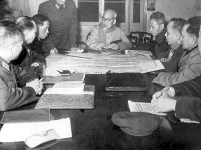“Bác Hồ cùng các uỷ viên Bộ Chính trị họp bàn chiến dịch Tết Mậu Thân 1968. Ảnh tư liệu.” Nguồn: VietnamNet