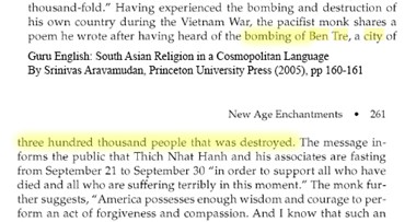 Thật ra câu tuyên bố của viên Thiếu tá Mỹ không tên tuổi, trong bản tin của Peter Arnett, không chỉ được xào nấu suốt cuộc chiến Việt Nam. Đến 32 năm sau biến cố Thảm sát Tết Mậu Thân, sư ông Nhất Hạnh vẫn chưa chịu thôi không sử dụng bản “tin” trên để (tuyên) truyền đạo như lần nói pháp ở nhà thờ Riverside, New York, sau cuộc khủng bố 911. Sư Nhất Hạnh lại nhắc đến vụ đánh bom huỷ cả thị xã Bến Tre với “300.000 người”. Nói đi như thế nhưng sau đó, khi trả lời Anne A. Simpkinson, sư ông nói lại Mỹ đánh bom huỷ cả Bến Tre với “300.000 nóc gia” (31). Chưa đến 1 tháng, sư ông Nhất Hạnh đã đổi giọng hai lần.