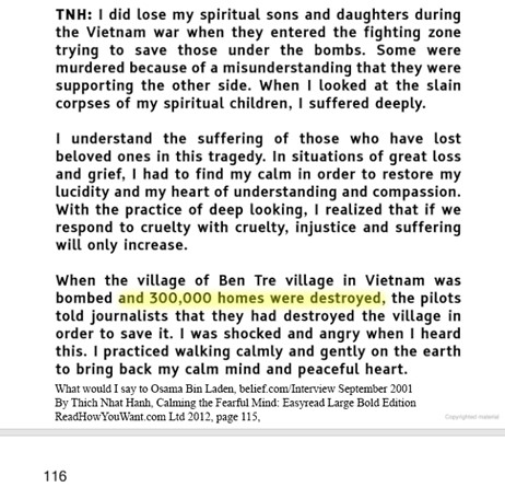 “…we learned of the bombing of the Bentre village in Vietnam, where 300,000 homes were destroyed, and the pilots told journalists that they had destroyed the village in order to save it…” Trích What I Would Say to Osama bin Laden? Zen monk Thich Nhat Hanh talks about how listening is the first step towards peace; Interview by Anne A. Simpkinson Beliefnet.com October 2001.