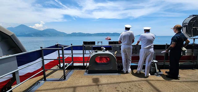 Sĩ quan Hải Quân Mỹ ngắm nhìn Đà Nẵng và dãy núi Hải Vân từ tàu Hàng không mẫu hạm Ronald Reagan
