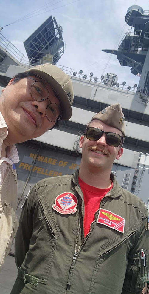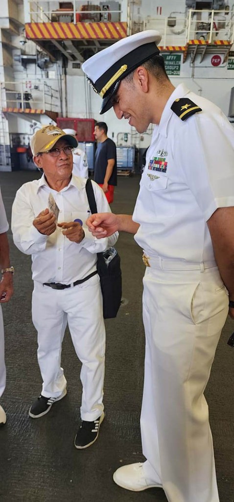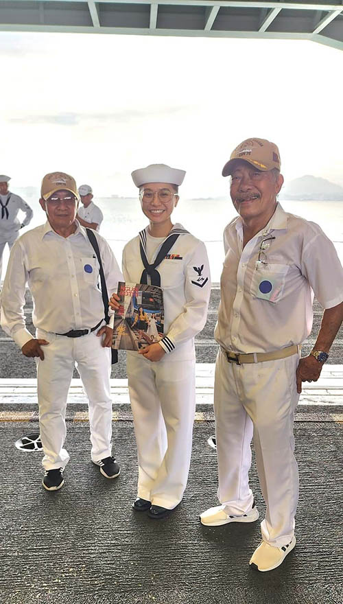 Cựu binh Lữ Công Bảy trao đổi kỷ niệm đi thăm Hàng không mẫu hạm Mỹ năm 1972 tại Philippines với sĩ quan Mỹ