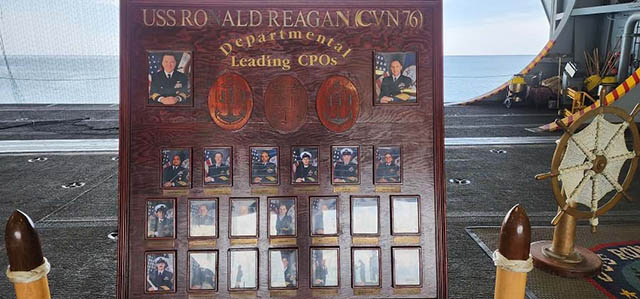 Các sĩ quan, thủy thủ Mỹ tươi cười, đón chào khách dưới một biểu ngữ lớn, ghi hàng chữ POWER THROUGH STRENGTH (tạm dịch Sức mạnh tạo nên quyền lực), lời của Tổng thống Mỹ Ronald Reagan.