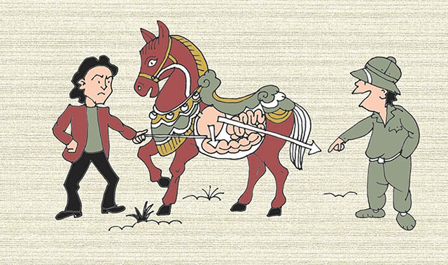 “Thú thiệt với ông! Nhỏ lớn tui chỉ thấy con ngựa chớ chưa thấy ruột ngựa bao giờ. Mà tui e chắc ông cũng vậy. Do đó ông muốn ‘dạy đời’ nói cái nầy đúng; nói cái kia sai, để ông chĩa, để ông đâm xuồng bể thì ông đã kiếm trật người rồi. Tui thấy ông nên kiếm ông Sơn Nam mà cãi nhé!” Ai dè cây muốn lặng mà gió chẳng chịu ngừng, thằng chả chụp cho tui cái nón cối to tổ bố. Thằng chả nói tui viết báo mà quen cái ‘thói hèn nhát’ của bọn nhà báo CS khoái xài, xài thường nên xài rất thiện nghệ là khi viết trật bèn đưa tai to mặt bự ra mà đỡ đạn. Nghe mới ứa gan chớ! Giả nói vầy: “Chẳng lẽ không nghe người lớn nói; thành ngữ cũng có ghi. Lại còn mượn Sơn Nam ra đỡ đạn”