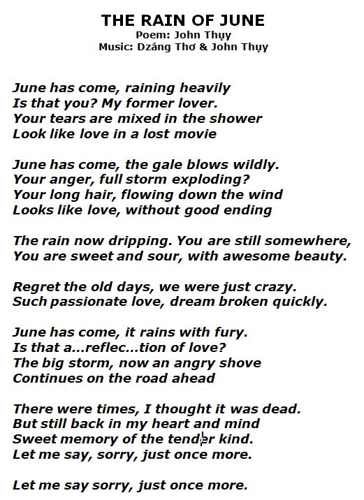 Tháng Sáu Mưa Về Thơ: John Thụy, nhạc: Dzáng Thơ, John Thụy Mời nghe Quang Vũ trình bày ca khúc Tháng Sáu Mưa Về: Share this: Share on X (Opens in new window) X Share on Facebook (Opens in new window) Facebook Like Loading...