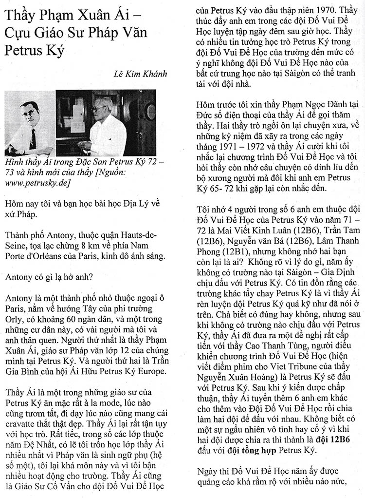 Thầy Phạm Xuân Ái – Cựu Giáo Sư Pháp Văn Petrus Ký Lê Kim Khánh (Nguồn: Đặc san “Tạ Ơn Thầy, Nhớ Ơn Cô” – Học trò Petrus Ký) Share this: Click to share on X (Opens in new window) X Click to share on Facebook (Opens in new window) Facebook Like Loading...