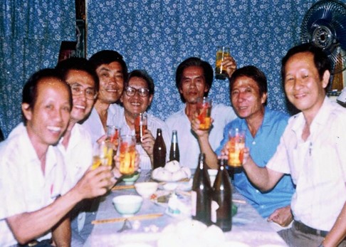Bọn tôi cũng sớm nhận ra là thật ra Thầy rất hiền lành, không bao giờ thấy Thầy giận dữ, la mắng hay phạt cấm túc học trò. Đặc biệt là Thầy rất thương một học sinh của Lớp Đệ Thất F, là anh Hà Kim Phước, về sau này, khi đã trưởng thành, rời Trường, ra đời đi làm việc, mỗi lần có dịp tập hợp ăn nhậu với nhau, hễ nhắc tới anh Phước, bọn tôi đều gọi là “thằng Phước con Ông Hòa.” Anh Phước về sau trở thành một Giáo Sư dạy Anh Văn tại một số trường trung học tư thục tại Sài Gòn. Rất may mắn, tôi còn giữ được tấm hình hiếm quý sau đây, quy tụ được một số bạn học Lớp Đệ Tứ F (1956-1957), trong đó có anh Phước, sau ngày 30-4-1975, trong một buổi nhậu tại nhà bạn Võ Văn Minh.[1] Tấm ảnh này đã được chụp vào khoảng sau năm 1990 khi một số bạn học cựu sĩ quan cấp tá của Quân Lực Việt Nam Cộng Hòa đã được thả về từ các trại học tập cải tạo ở Miền Bắc.