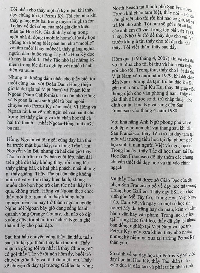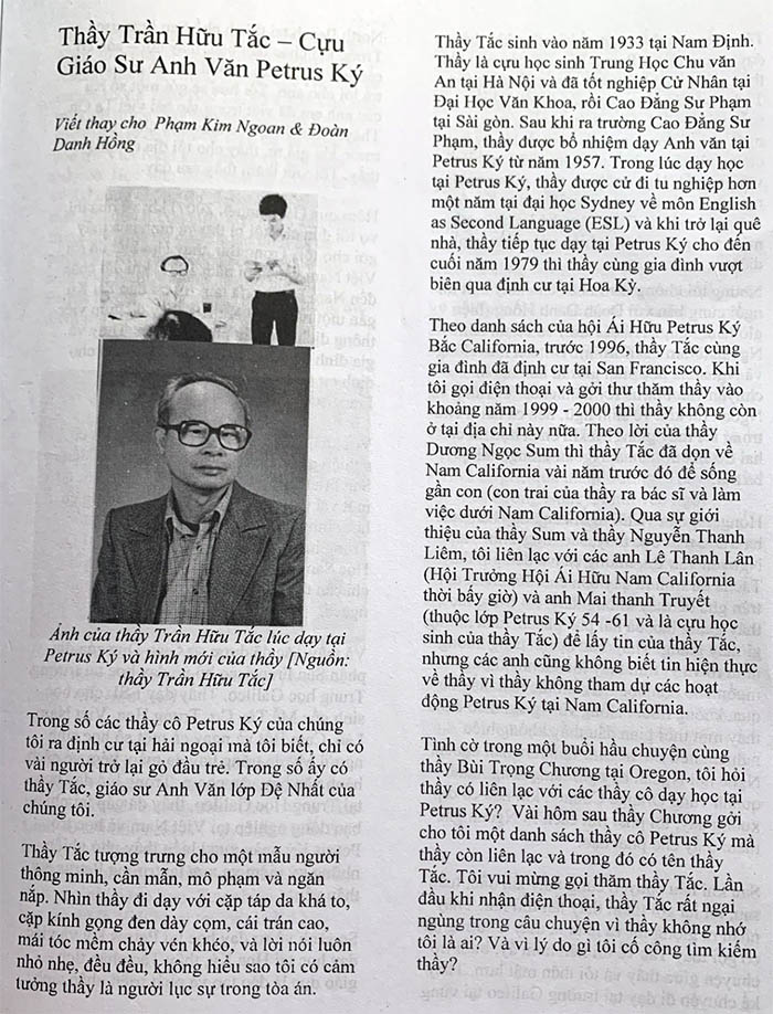 Thầy Trần Hữu Tắc – Cựu Giáo Sư Anh Văn Petrus Ký Viết thay cho Phạm Kim Ngoan & Đoàn Danh Hồng Nguồn: Đặc san “Tạ Ơn Thầy, Nhớ Ơn Cô” – Học trò Petrus Ký Share this: Click to share on X (Opens in new window) X Click to share on Facebook (Opens in new window) Facebook Like Loading...