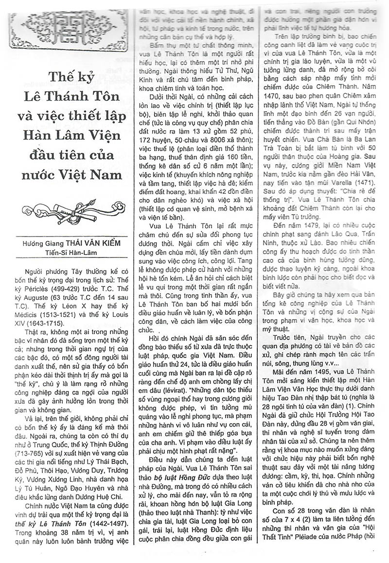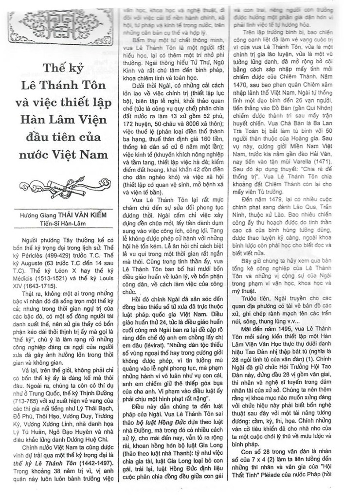 Thế kỷ Lê Thánh Tôn và việc thiết lập Hàn Lâm Viện đầu tiên của nước Việt Nam (Nguồn: Nội san – Hè 2004, Hội Ái hữu Trung học Petrus TVK tại Pháp) Hương Giang Thái Văn Kiểm Share this: Click to share on X (Opens in new window) X Click to share on Facebook (Opens in new window) Facebook Like Loading...