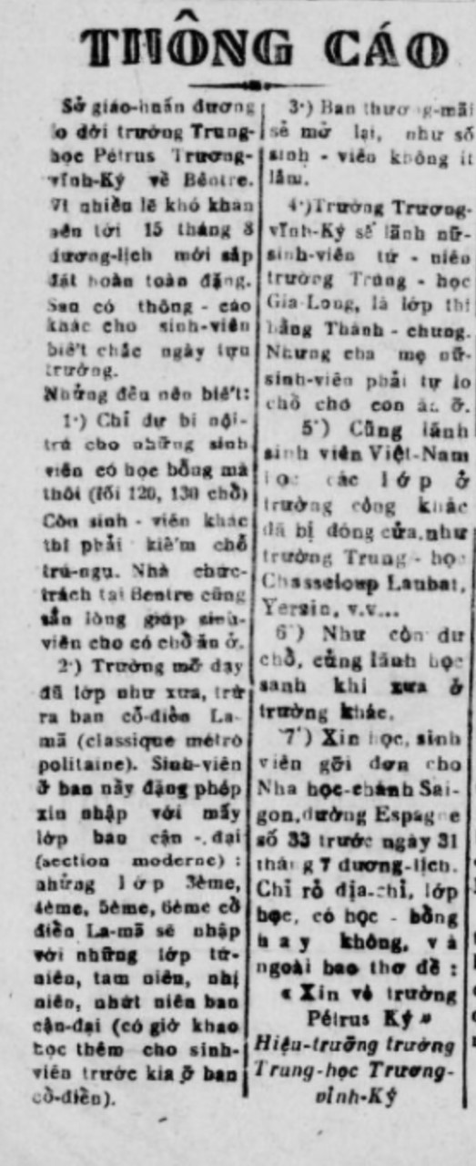 Thông cáo do ông Hiệu trưởng trường Trung học Trương Vĩnh Ký (M. Taillade) loan báo, và có vài điểm đáng lưu ý như sau: