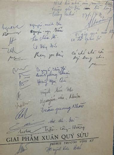 Cùng trang bìa sau của tờ báo Xuân Quý Sửu 73, món quà do thầy Chương gởi cho thầy Lập, là chữ ký của 14 vị giáo sư có tên dưới đây: