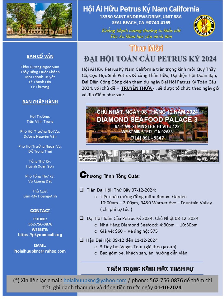 Thư mời tham dư Đại Hôi Toàn Cầu 2024 – Hội Ái Hữu Petrus Ký Nam Cali Share this: Share on X (Opens in new window) X Share on Facebook (Opens in new window) Facebook Like Loading...
