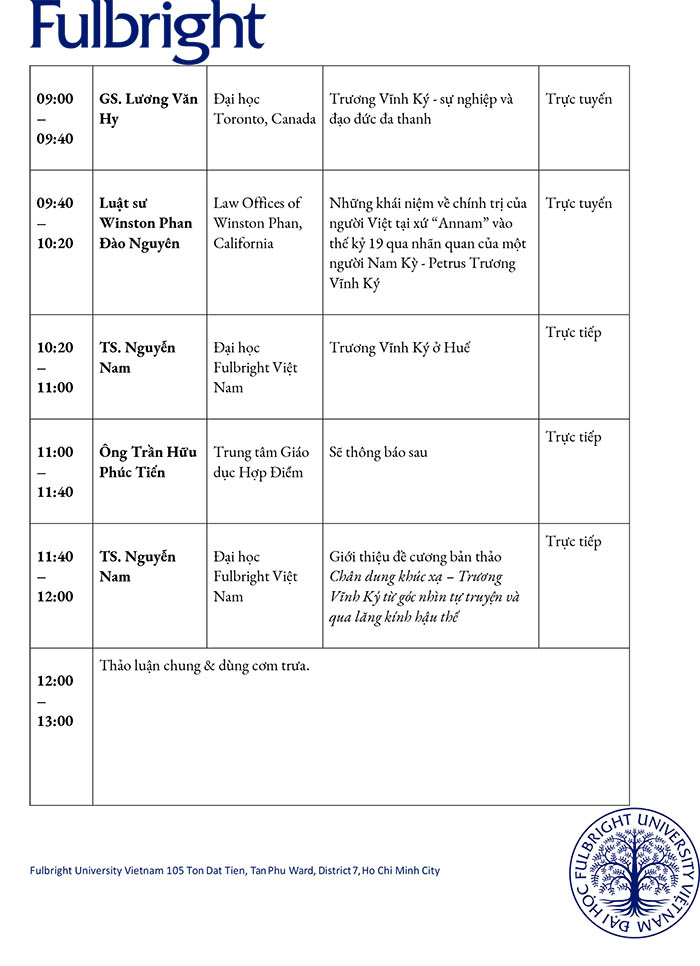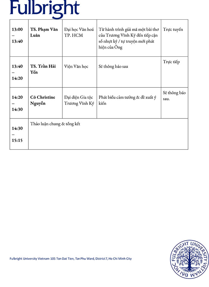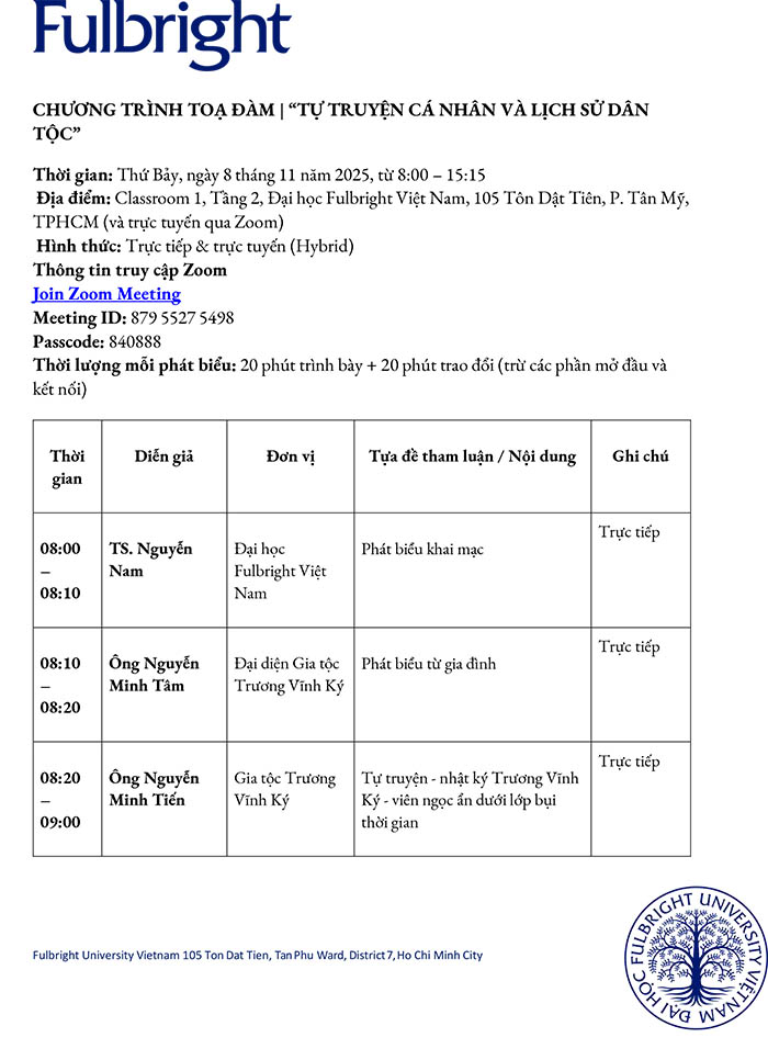 Địa điểm: Classroom 1, Tầng 2, Đại học Fulbright Việt Nam,105 Tôn Dật Tiên, P. Tân Mỹ, TP. Hồ Chí Minh