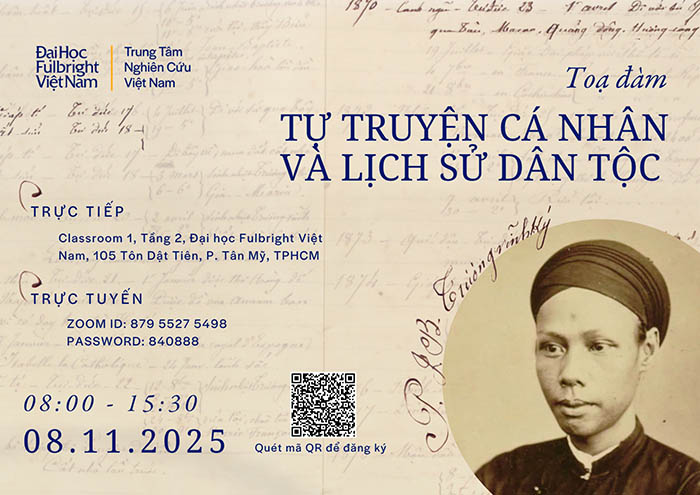 Trung tâm Nghiên cứu Việt Nam, Đại học Fulbright Việt Nam trân trọng kính mời Quý vị tham dự Tọa đàm “Tự truyện cá nhân và lịch sử dân tộc”, nằm trong chuỗi hoạt động nghiên cứu về nhân vật Trương Vĩnh Ký và di sản của ông.
