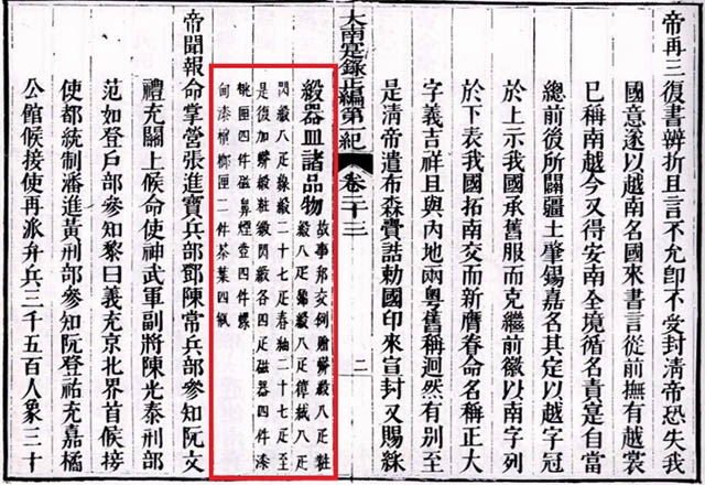 [2] Lệ bang giao cũ tặng đoạn mãng (đoạn thêu rồng 4 móng) 8 tấm, đoạn mỡ 8 tấm, đạo [đoạn] gấm 8 tấm, nhung dài lông 8 tấm, đoạn bóng 8 tấm, đoạn tơ 27 tấm, trừu mùa xuân 27 tấm. Đến nay lại thêm đoạn mãng, đoạn mỡ, đoạn bóng mỗi thứ 4 tấm, đồ sứ 4 cái, hộp quả đào sơn 4 cái, điếu sứ hút thuốc 4 cái, quả trầu sơn khảm ốc 2 cái, là chè 4 bình. Đại Nam Thực Lục, tập Một do Tổ Phiên Dịch Viện Sử Học (Giáo Dục: 2002) tr. 581. Tuy nhiên khi tra lại trong Đại Thanh Hội Điển Sự Lệ, quyển 508 (Lễ Bộ, Triều Cống) thì đây là lần ban thưởng khi đời Gia Long sang nạp cống lần thứ nhất.