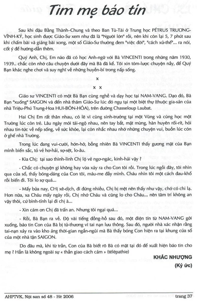 Tìm mẹ báo tin Khắc Nhượng (Nguồn: Nội san số 48 – Hè 2006, Hội Ái hữu Trung học Petrus TVK Pháp) Share this: Click to share on X (Opens in new window) X Click to share on Facebook (Opens in new window) Facebook Like Loading...