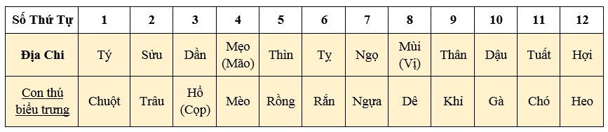 – Tên 12 Địa Chi, mỗi Địa Chi được biểu trưng bởi một con thú, theo thứ tự như sau: