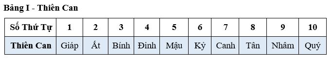 Lấy Số Dư của phép toán chia là Số Thứ Tự trong Bảng I (hàng trên), tương ứng với Thiên Can ở hàng dưới.