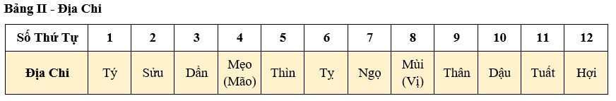 Lấy Số Dư của phép toán chia là Số Thứ Tự trong Bảng II (hàng trên), tương ứng với Địa Chi ở hàng dưới.