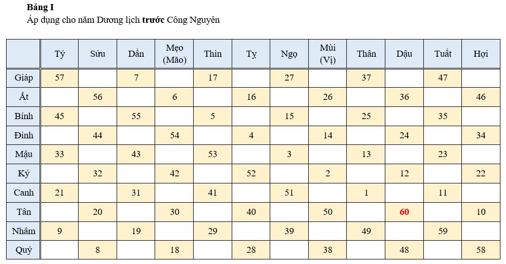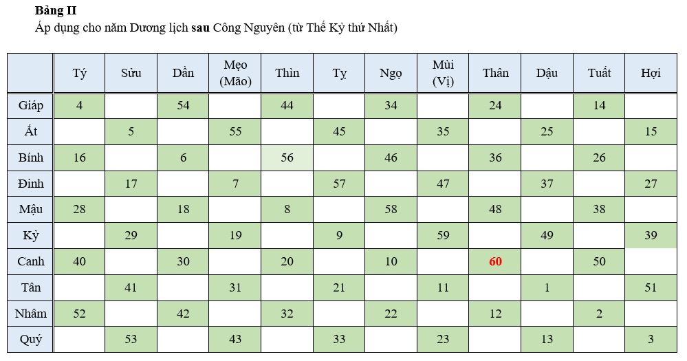 – Trong các Bảng I. và Bảng II. có số 60 (màu đỏ), nhưng khi một số năm Dương lịch chia chẵn cho 60 thì Số Dư là 0 (không có Số Dư 60).