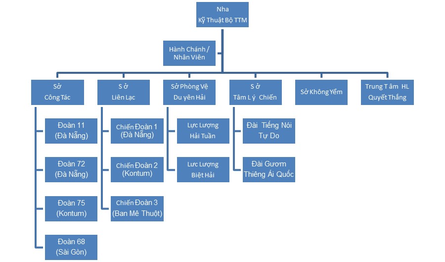 - Tại trung ương, đứng đầu là 1 vị Trưởng Khối được xếp ngang hàng với một Tổng Giám Ðốc, bên dưới gồm một số Nha do các vị Giám Ðốc chỉ huy; đó là các Nha Tình Báo, Nha Phản Tình Báo, Nha Ðiều Hành Công Tác, và Nha Yểm Trợ; dưới các Nha có các Sở (do Chánh Sở chỉ huy), Phòng (do Chủ sự chỉ huy), và Ban (do Trưởng Ban chỉ huy) đảm trách các công tác chuyên môn khác nhau