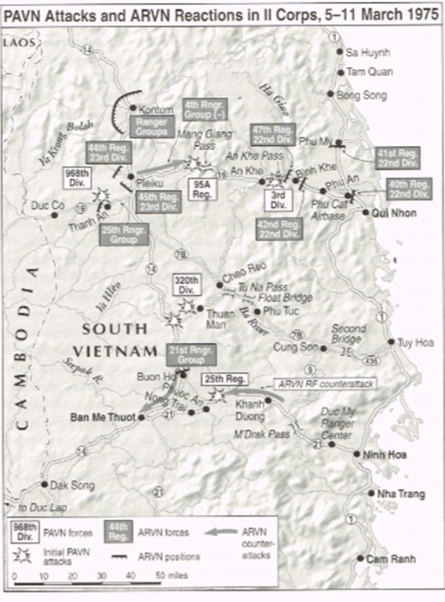 Ðầu tháng 2-1975, một đơn vị của Sư Ðoàn 22 Bộ Binh QLVNCH bắt được 1 binh sĩ Bắc Việt tại một địa điểm ở phía Tây tỉnh Bình Ðịnh gần đèo An Khê. Qua thẩm vấn được biết binh sĩ này đã tháp tùng viên tư lệnh của Sư Ðoàn 3 Bắc Việt đi thám sát đèo An Khê. Trong mình binh sĩ này có giữ một bản đồ ghi rõ các địa điểm mà Sư Ðoàn 3 dự định sẽ đóng chốt để cắt đứt Quốc Lộ 19 là con đường huyết mạch nối liền Qui Nhơn (tỉnh lỵ của tỉnh Bình Ðịnh) với Pleiku. Cùng lúc đó, Phòng 2 của Quân Ðoàn II cũng bắt được tin Sư Ðoàn 968 Bắc Việt đang đóng tại Lào đã di chuyển sang lãnh thổ VNCH. Tướng Phú tin rằng Cộng quân đang chuẩn bị tấn công Pleiku, và ông đã ra lệnh cho Trung Ðoàn 47 của Sư Ðoàn 22 Bộ Binh đến trấn giữ đèo An Khê.78 Lý do Trung Ðoàn 47 được giao cho nhiệm vụ này vì vị sĩ quan Trung Ðoàn Trưởng, Trung Tá Lê Cầu, là người rất quen thuộc địa hình vùng đèo An Khê vì ông đã từng chiến đấu tại đây trong trận Tổng Tấn Công Mùa Hè 1972. Trong suốt tháng 2-1975, các đơn vị Cộng quân hiện diện trong vùng liên tục pháo kích Kontum và Pleiku cũng như đánh phá các chốt bảo vệ đèo An Khê trên Quốc Lộ 19 của Trung Ðoàn 47.79 Các đơn vi này do 2 Sư Ðoàn F10 và 320 để lại để thực hiện kế hoạch nghi binh, còn toàn bộ 2 sư đoàn này đã di chuyển xuống phía Nam để chuẩn bị tấn công Ban Mê Thuột. Tất cả những hoạt động này của địch làm cho Tướng Phú càng thêm tin là Pleiku sẽ là mục tiêu chính của cuộc tấn công sắp tới của Cộng quân.