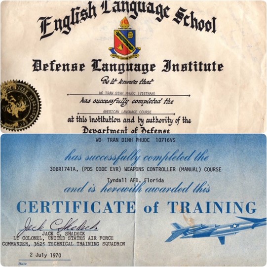 – Chứng chỉ học ngành chuyên môn về Weapons Controller (Manual) Course tại Tyndall AFB (Florida), trên có đóng dấu tròn màu vàng, mà tôi còn giữ được, trong khi các giấy tờ, hồ sơ và hình ảnh khác có liên quan tới chính quyền Việt Nam Cộng Hoà thì gia đình tôi vì sợ, nên đã đốt hết trong thời gian tôi vắng nhà.