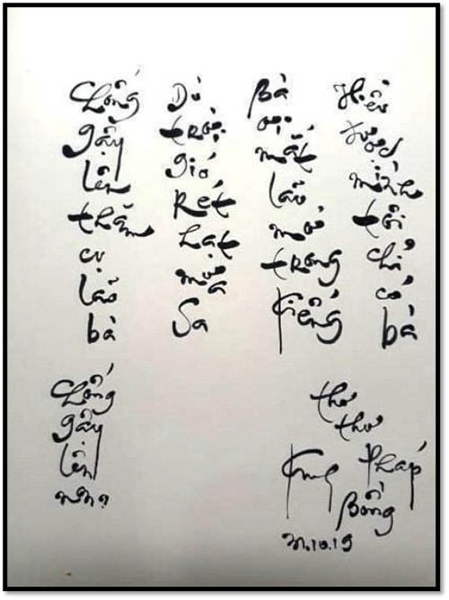 Cụ lắc đầu, thở hổn hển không trả lời. Tôi nán lại bên cụ tỏ ý muốn giúp đỡ, nếu cụ cần. Hiểu ý, cụ khoát tay tôi cứ đi, xong cụ lần từng bước đi tiếp. Biết không thể vừa đi vừa bắt chuyện với cụ như những thanh niên, tôi gật đầu chào cụ rồi tiếp tục rảo bước nhanh cho kịp tới Chùa bữa cúng ngọ.