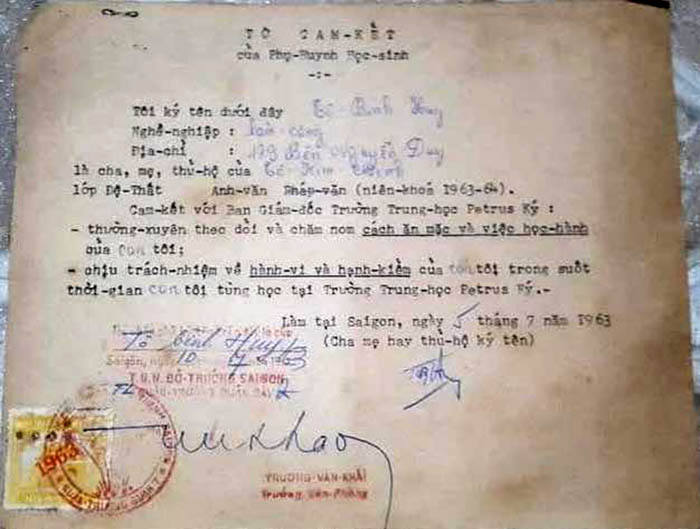 * Đây là giấy cam kết do phụ huynh anh Tô Kim Minh ký tên. Có tìm thấy tên anh Minh trong DSHS lớp Thất 6 nk 63-64, người bạn cùng lớp với anh Son Huynh Huỳnh Xuân Sơn, đương kim Hội trưởng, Hội AH CHS Petrus Ký Nam Cali. Giấy được rao bán trên FB từ năm 2019 với giá 400,000.